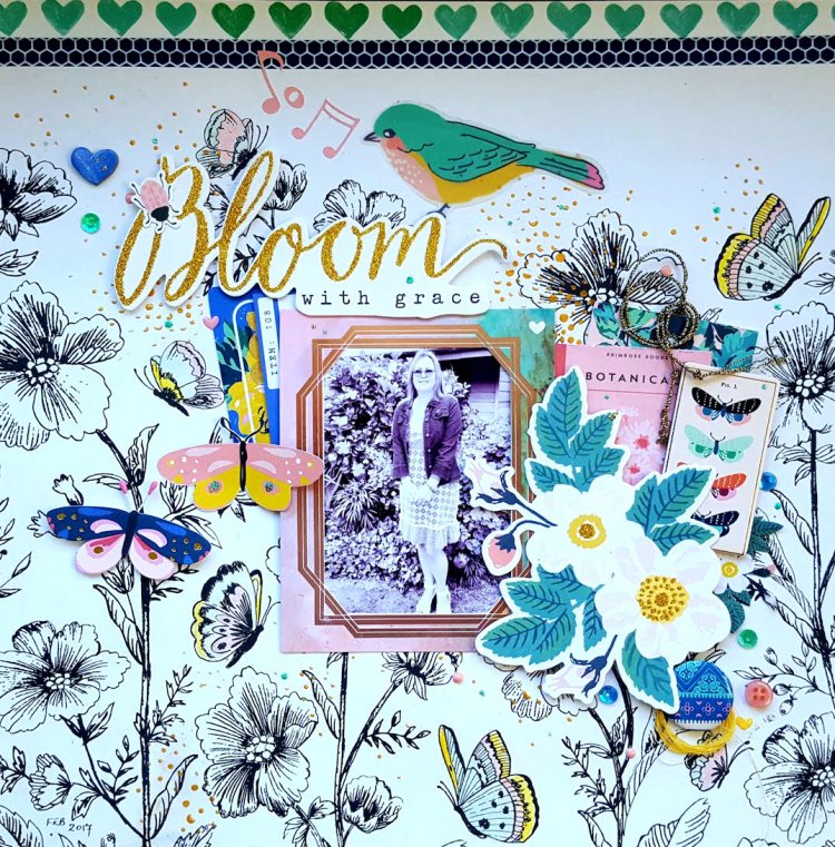 I’m using Crate Paper’s beautiful collection from the lovely Maggie Holmes called Flourish. Have you been scrapping with it yet? It’s just so delicious and the ephemera is so pretty.