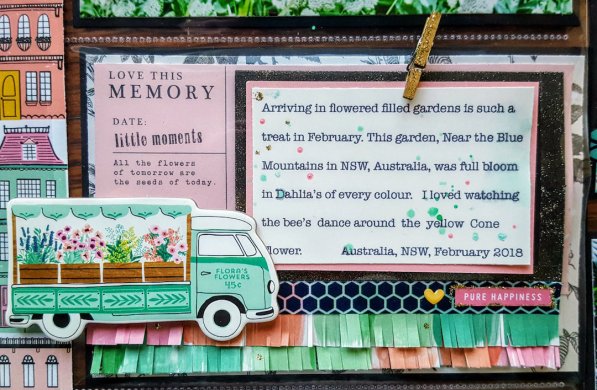 What’s also fun about scrapping with Project Life Pockets is, you make little scraps for inside the pockets AND also decorate the top of the pockets. Like these scraps designed for one pocket. The fringe, flower truck and journal card are all on the outside of the pocket.