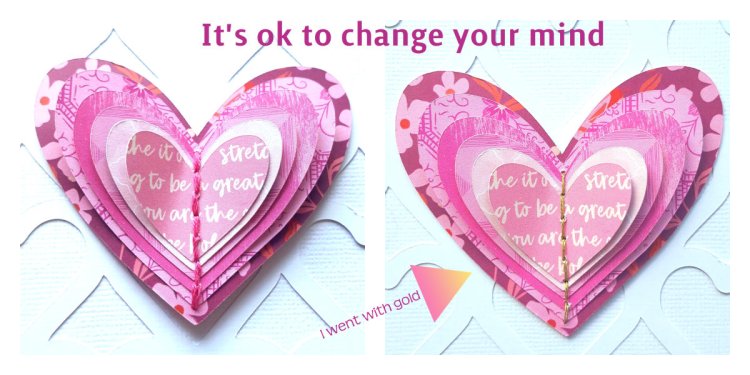 Initially, I choose a pink embroidery floss but decided it got lost on the pink paper and changed it to gold. What colour would you have use?