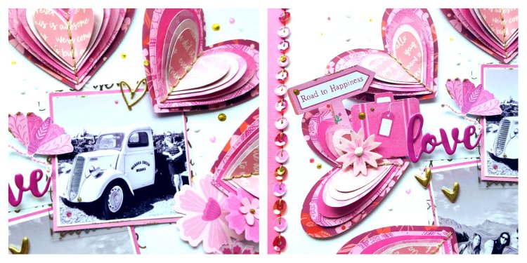 In the end, with the background white, I played up the boarder by framing it in a bright pink and sewed on sequins. Even though my wreath is round, I added all the other items in a diagonal, from top left to bottom right. The hearts were also mounted on foam to add depth. Finally, I ruffled up each heart for maximum texture. Again, here’s my finished layout.
