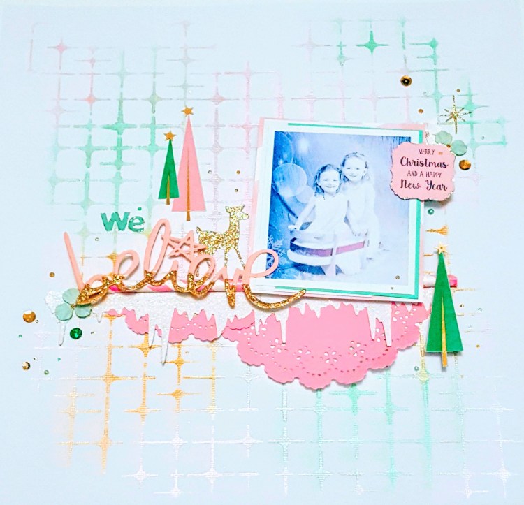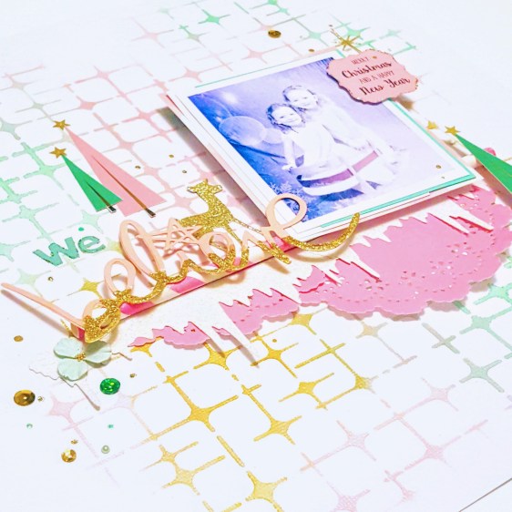 As promised, today I’m sharing a mixed media layout designed for the Treasured Memories December Scrapbook Kit. With a little paint and your favourite stencil, you can easily turn plain white cardstock into a pretty background for your layouts.