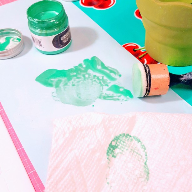 Pick up a little paint from the jar with a small brush and swipe it on to your craft mat. Add a very small amount of water and blend. Lightly swipe your blending brush through the paint. Now dab your blending brush onto a paper towel to remove most of the moisture. A dryer blender is desired so that the paint doesn’t seep under the stencil. Hold the stencil down firmly to the paper as you go.