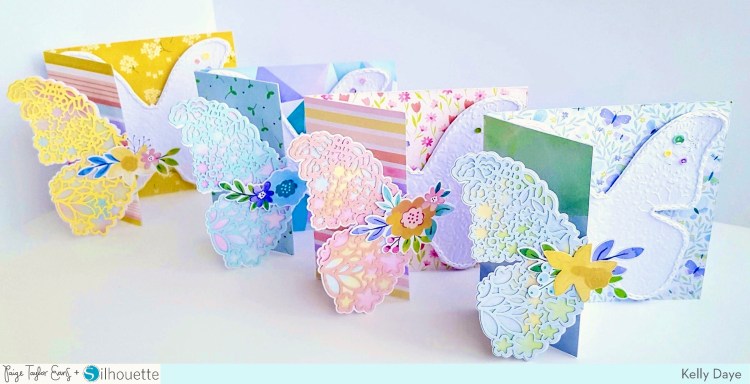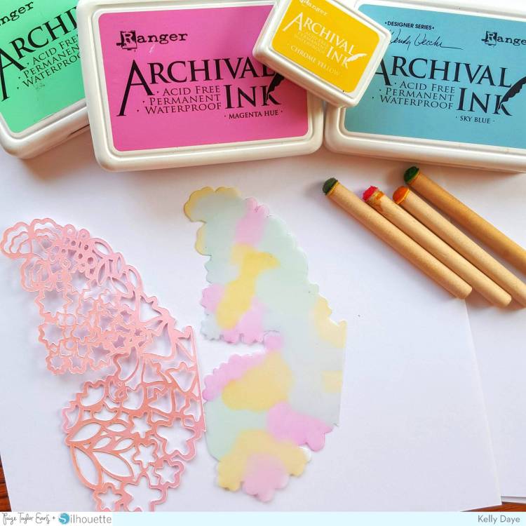 I also cut a piece of vellum the exact size as the floral butterfly wing to lay beneath the cut file. Each one was randomly tinted with various Archival Inks. Once glued together, the floral wing was taped to the card front.