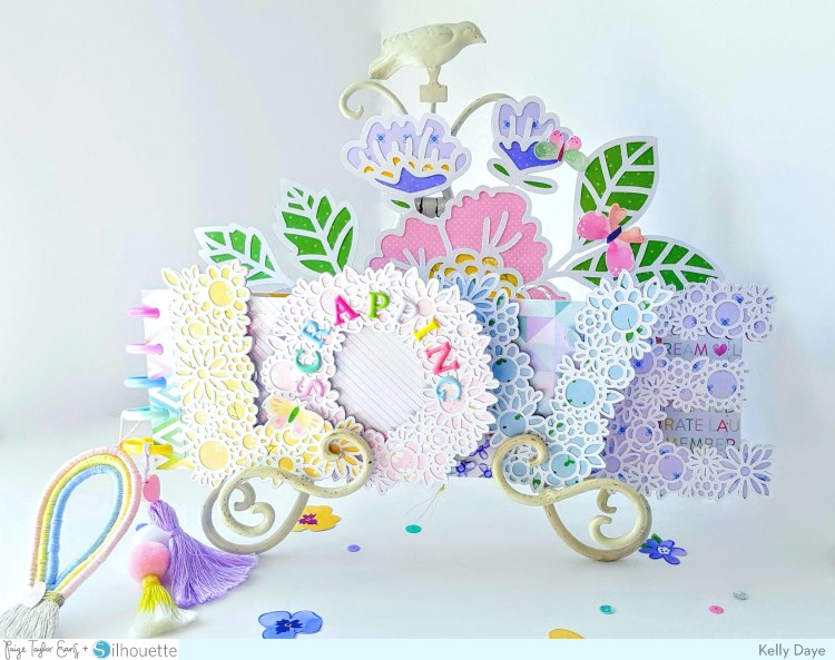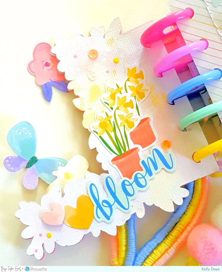 I used heavy white cardstock as the base of my album, designing it in Silhouette using Paige’s Love In Flowers cut file and Flower cut file . Each letter was cut out of White AC cardstock and backed with soft pastel Bloom Street papers. The design looked like this: