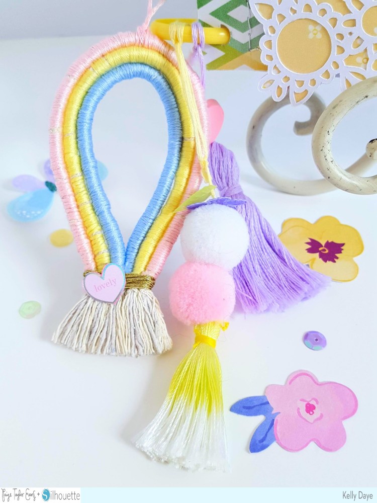 Naturally, I had to have tassels and chose one from cute Bloom Street Tassel Set. Leave it to me to take things apart. I wanted the pink heart on a mauve tassel I made with DMC Embroidery Floss. Then, I tried something totally new! I made a macrame rope rainbow. I learned how with this video by Rachel Lowe! I adore Rachel and her style. Visit her Instagram for all the pretty things!