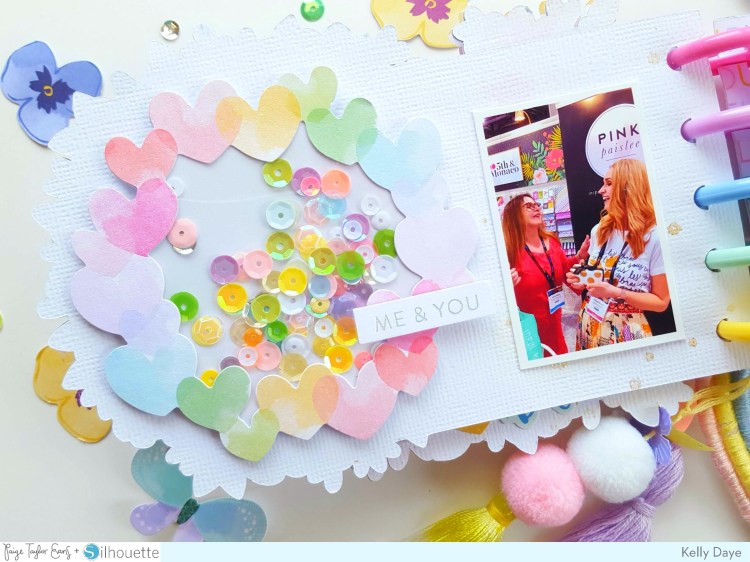 Page 3, a shaker made with the heart wreath from the Exclusive Bloom Street Ephemera package . There’s me meeting Paige at Creativation in January, hope I didn’t babble on too much !