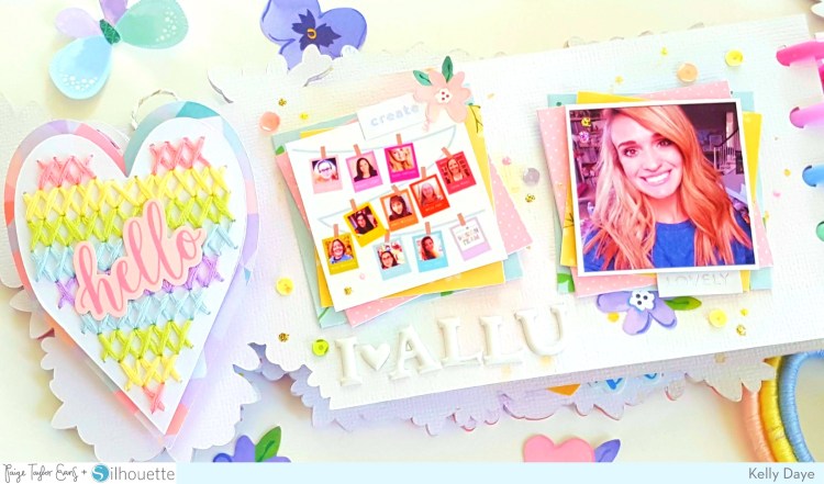 Page 5, above, is another mini in a mini. I’ve made a heart envelope to hold Paige’s Heart Mini Album cut file. The front of the envelope is cross stitched with DMC embroidery floss. I had my Cameo draw Paige’s Cross Stitched Heart cut file to use as a template. Just another way to use cut files! My title was made with Puffy Word Stickers . The word tags are from the Cardstock Sticker Sheet and the hello sticker is from the Exclusive Bloom Street Sticker Sheet.