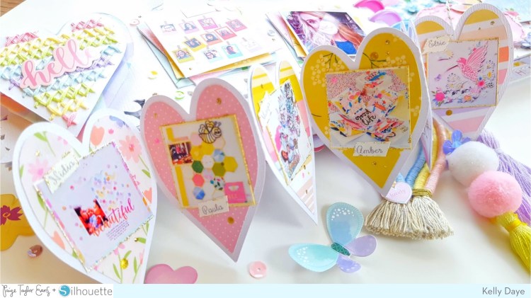 Each heart highlights a project by my talented teammates and of course a gorgeous inspiration from sweet Paige too. I cut out the folding heart from cardstock and covered each one with paper from the 6×8 Paper Pad or a wee scrap left from other projects.