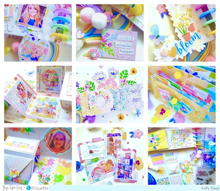 The back cover was the perfect spot for Paige’s Mini Album Card With Pocket Envelope & Tags cut file. The forth mini in this mini and the direct result of being unable to pick just one! After painting with Prima Pastel Dreams watercolours on watercolour paper, I used Paige’s brand new 6×6 Flower Stencil and white texture paste on top. I machine stitch the same paper to make a belly band and stapled on a Puffy Vinyl Butterfly Sticker as a closure.