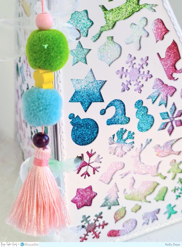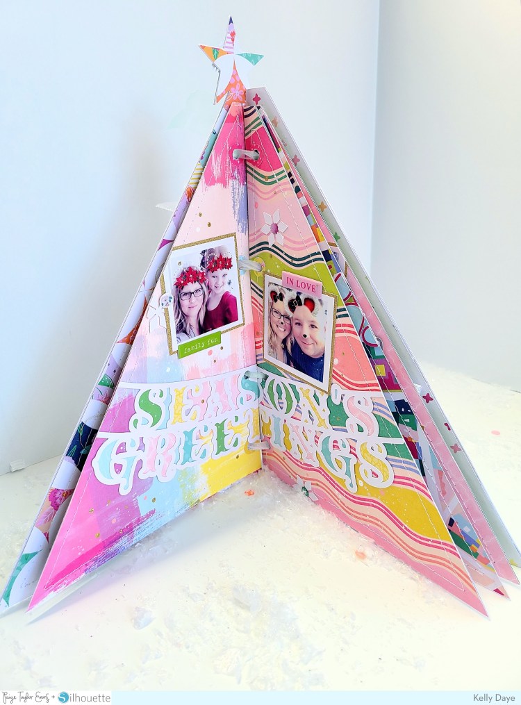 I envisioned a Christmas Tree filled with memories and used Paige’s Half Christmas Tree cut file cut from White AC Cardstock to make the covers. I traced a triangle around the cut file in Silhouette Studios but eliminated the square under the tree. I only included the star on the front cover so the album could open and close. I spray-glued a plain triangle and randomly sprinkled glitter all over it. This became my backing to the cut file.