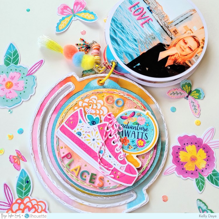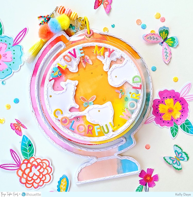Each tag is a nod to one of my aspirations this year. I added an acetate overlay to the cover to have a smooth surface for the Foam Mini Thickers title. You can separate the globe from the stand with the knife tool in Silhouette Studio.