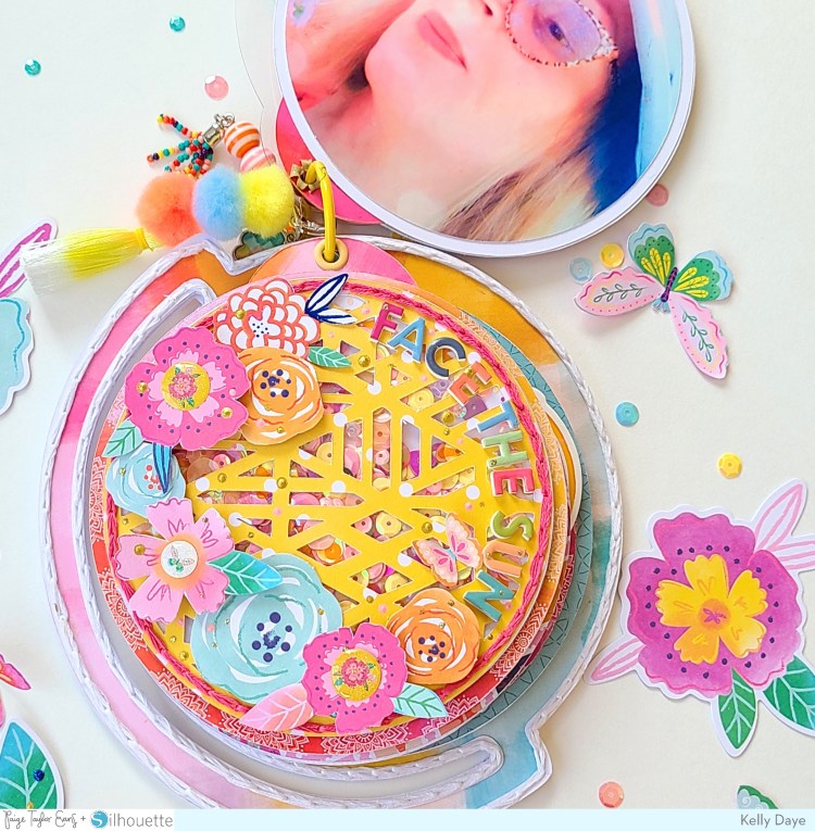 The first tag, Face The Sun, is a shaker made with Paige’s Aztec Background cut file. It’s adorned with pretty Floral Die Cuts and Enamel Stickers. To me, it’s a reminder to always focus on the positive.