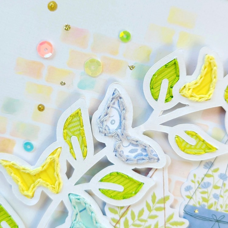 Before adding the stitched wreath to the background, I cut the cardstock down to 11.5 inches square and matted it on Blooming Wild Paper 3, then added a running-stitch all around. I struggled at picking a colour of DMC Floss, so I took two strands from each of the four colours I used to stitch the wreath and mixed them together. It turned out so pretty and chunky, kind of an opal colour.