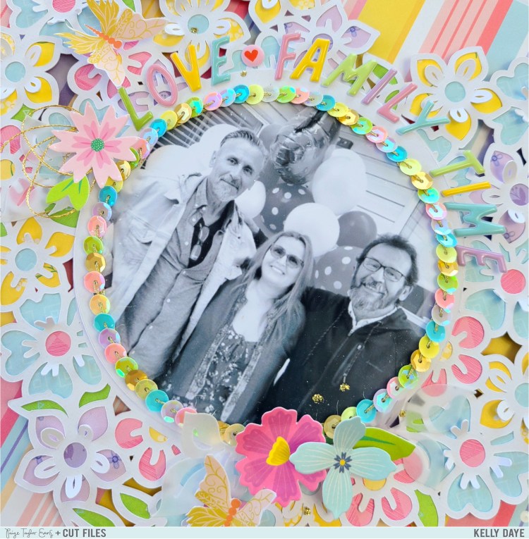 To begin, I made a circle frame in the Silhouette Design Studio and cropped out the centre of the Flower Heart cut file. This way, I didn’t have to paper-back the entire cut file. That saved time for lots of embellishing. Next, using Gold Metallic DMC Thread, I chain stitched sequins around the photo. I’m quite certain the bro’s love sparkly things too, ha!