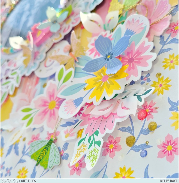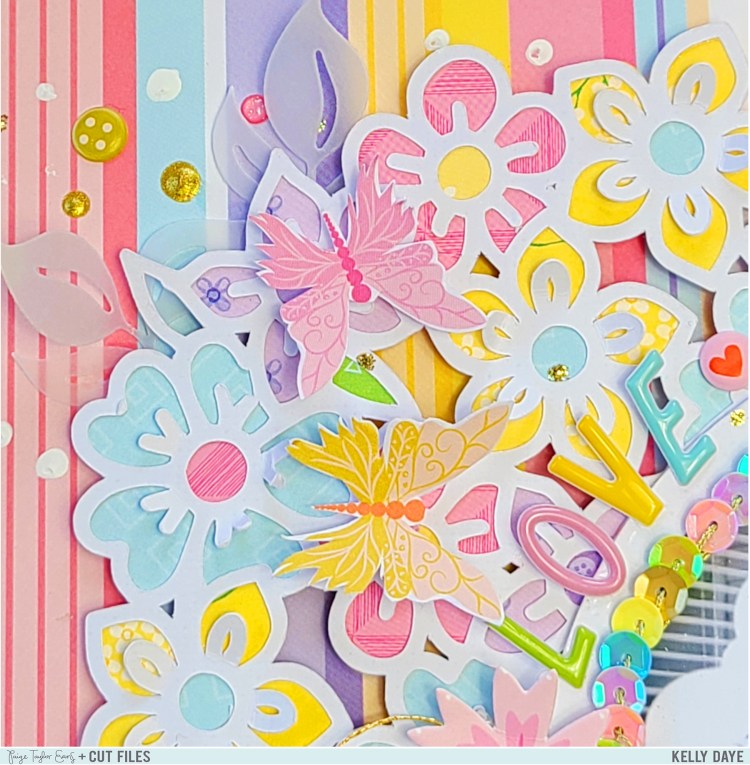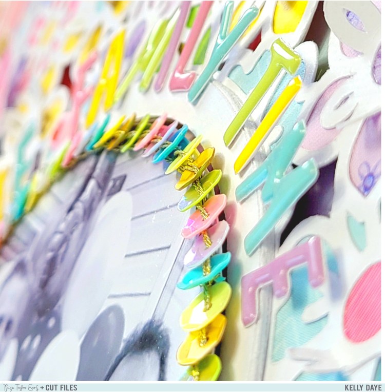 The title was actually made with a set of Phrase Thickers from Paige’s Wonders collection. I don’t mind breaking up the phrases to get the perfect coloured alphabet for my project. That’s why I always get two packs. I popped them up on a multi-layered frame, made of paper, so they would stand off the background.
